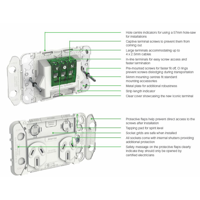 Clipsal Iconic GPO sockets feature grids with innovative protective flaps, which help prevent screw access after installation, allowing skins to be changed safely at any time.