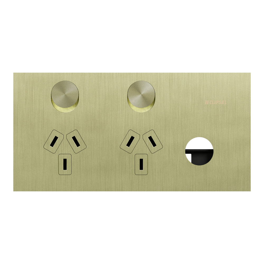 The Clipsal 1025XUA-LB Solis T Series Double Powerpoint 10A + Extra Blank Switch in Living Brass combines modern design with reliable functionality, making it the perfect choice for anyone looking to enhance their space with a stylish and practical power point solution.