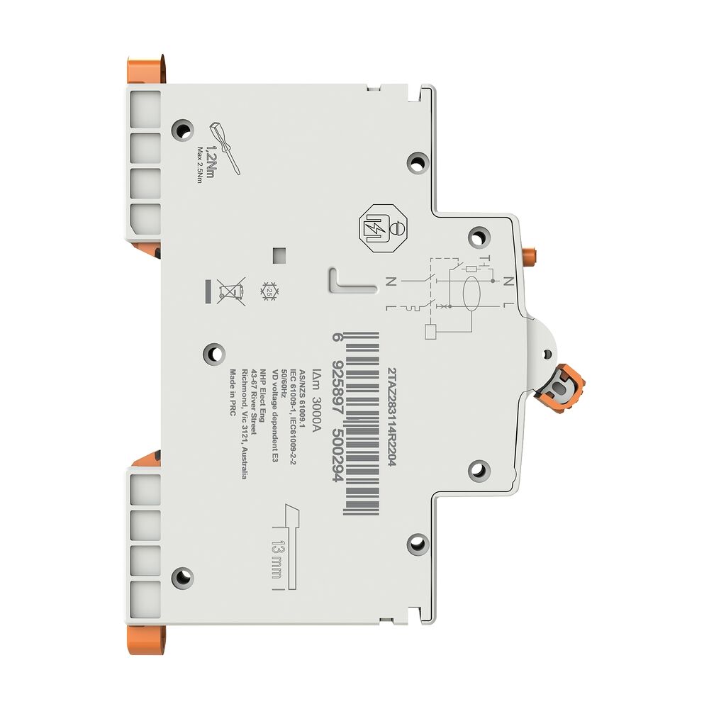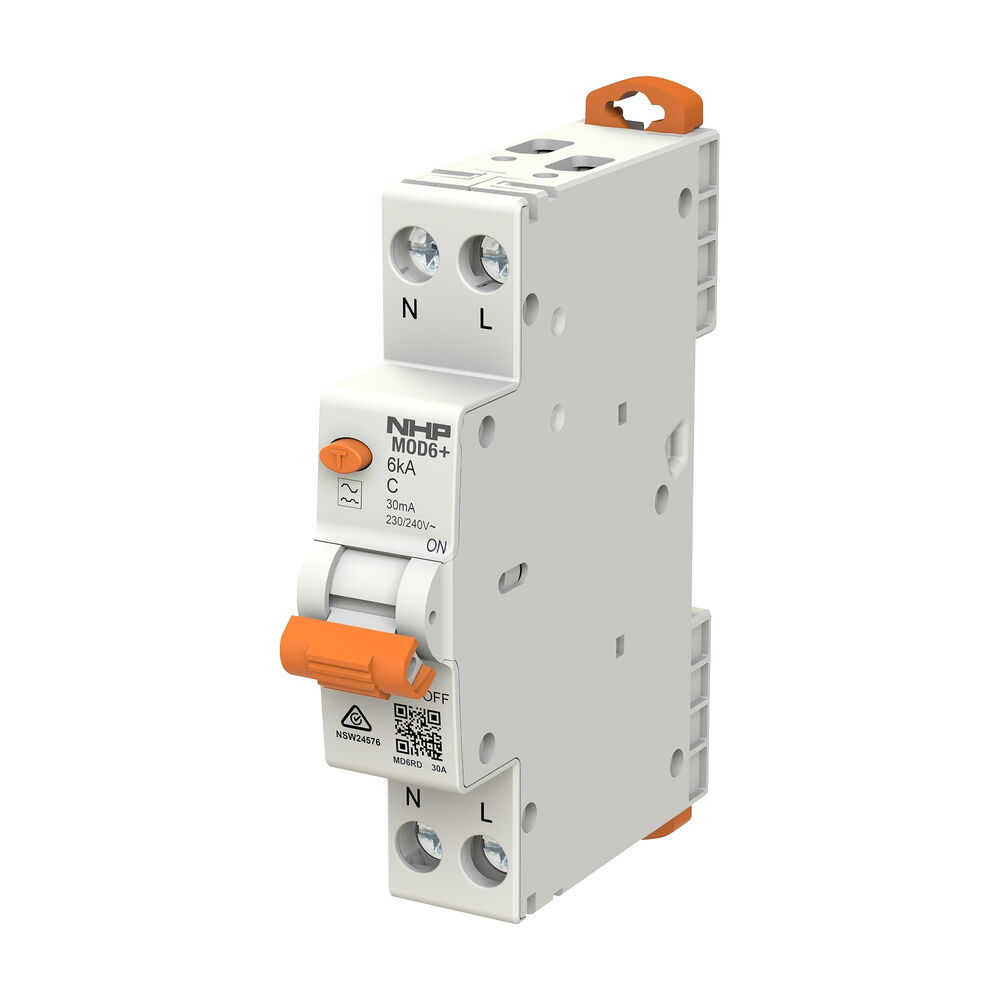 The NHP MOD6+ MD6RD Series is a compact and compliant 1 Pole + Neutral RCBO (Residual Current Circuit Breaker with Overcurrent) delivering dual protection against both overloads and earth leakage faults in residential and commercial switchboards. With ratings from 10A to 32A this Type A, C Curve device features a 30mA trip sensitivity, making it ideal for your lighting and power circuit needs.